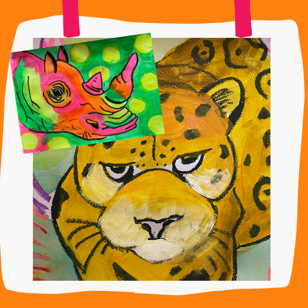 They’ll choose their favourite to sketch on canvas and use a variety of techniques, brushes and layers to create the texture, colours, shapes and detail of their wild animal and it’s habitat.